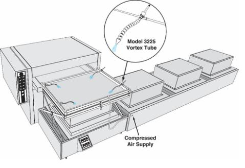 (4) Model 3225 Vortex Tubes were positioned to cool the critical corner areas just prior to forming the plastic sheet. By cooling these areas, less stretching of the plastic occurred, which resulted in thicker corners.