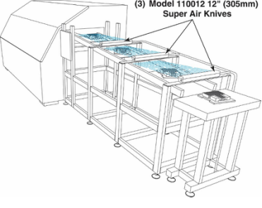 The laminar airflow of the Super Air Knives was the key to success in this application. Fan cooling could only provide random spikes of air at moderate velocities. The uniform sheet of air from the Super Air Knife quietly swept the heat away within the first 2-foot (610mm) of the conveyor. Low air consumption and the compact size of the Super Air Knife were an added bonus.