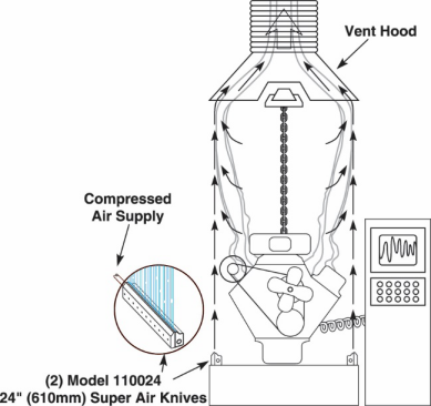A Model 110024 24” (610mm) Super Air Knife was mounted on both sides of the test stand. The sheet or “wall” of air produced by the Super Air Knife, captured, contained and diluted the smoke while directing it towards the vent hood. The environmental problem was solved without obstructing the technician’s observation of, or access to the stand.