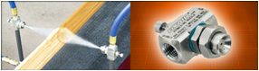 External mix nozzles have the highest flow rates and allow the air and liquid flows to be adjusted independently. These nozzles are best where precise liquid flow is needed. External mix nozzles can be used on liquids with a viscosity above 300 cp. Both air and liquid sides are pressure fed.